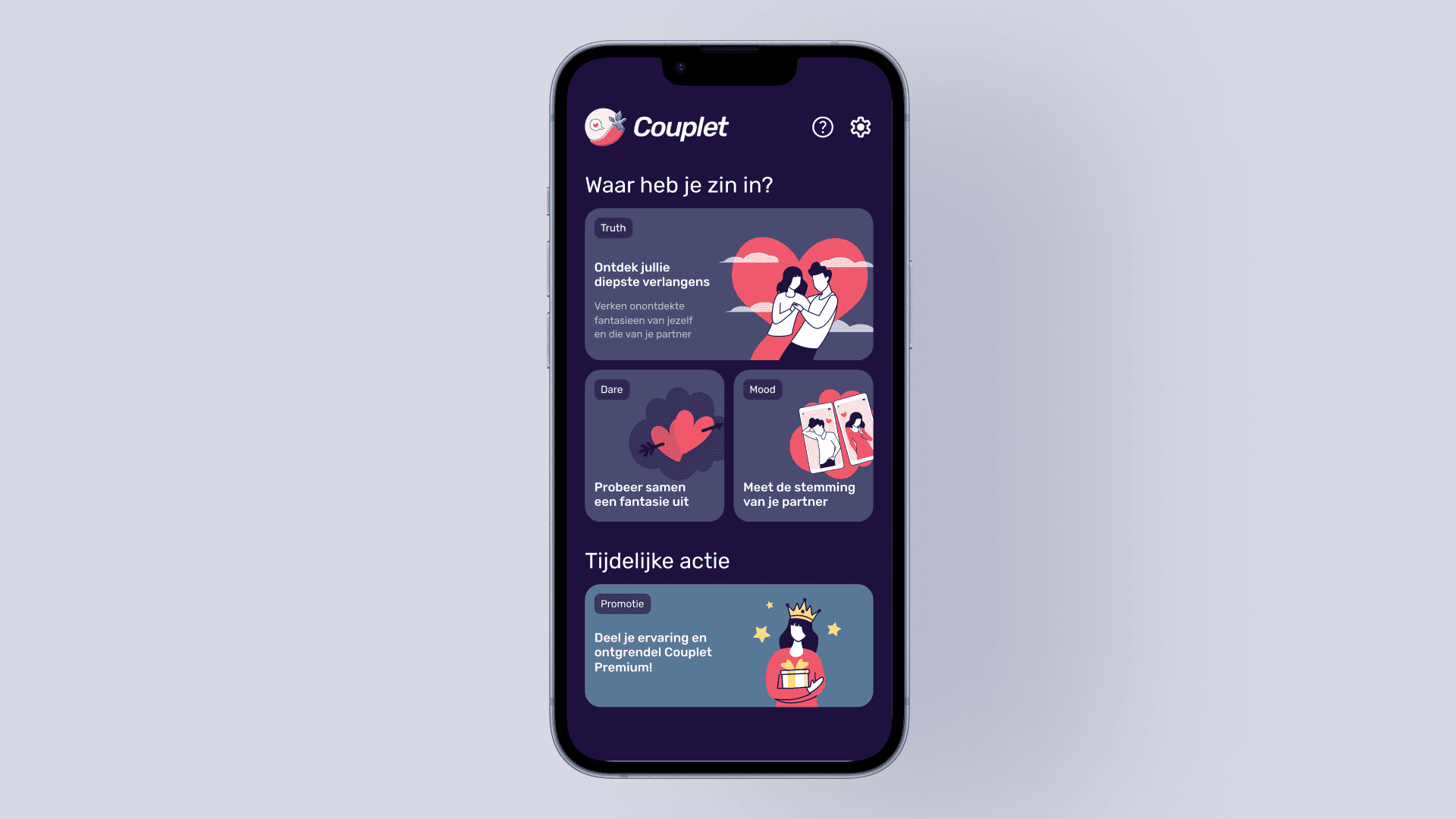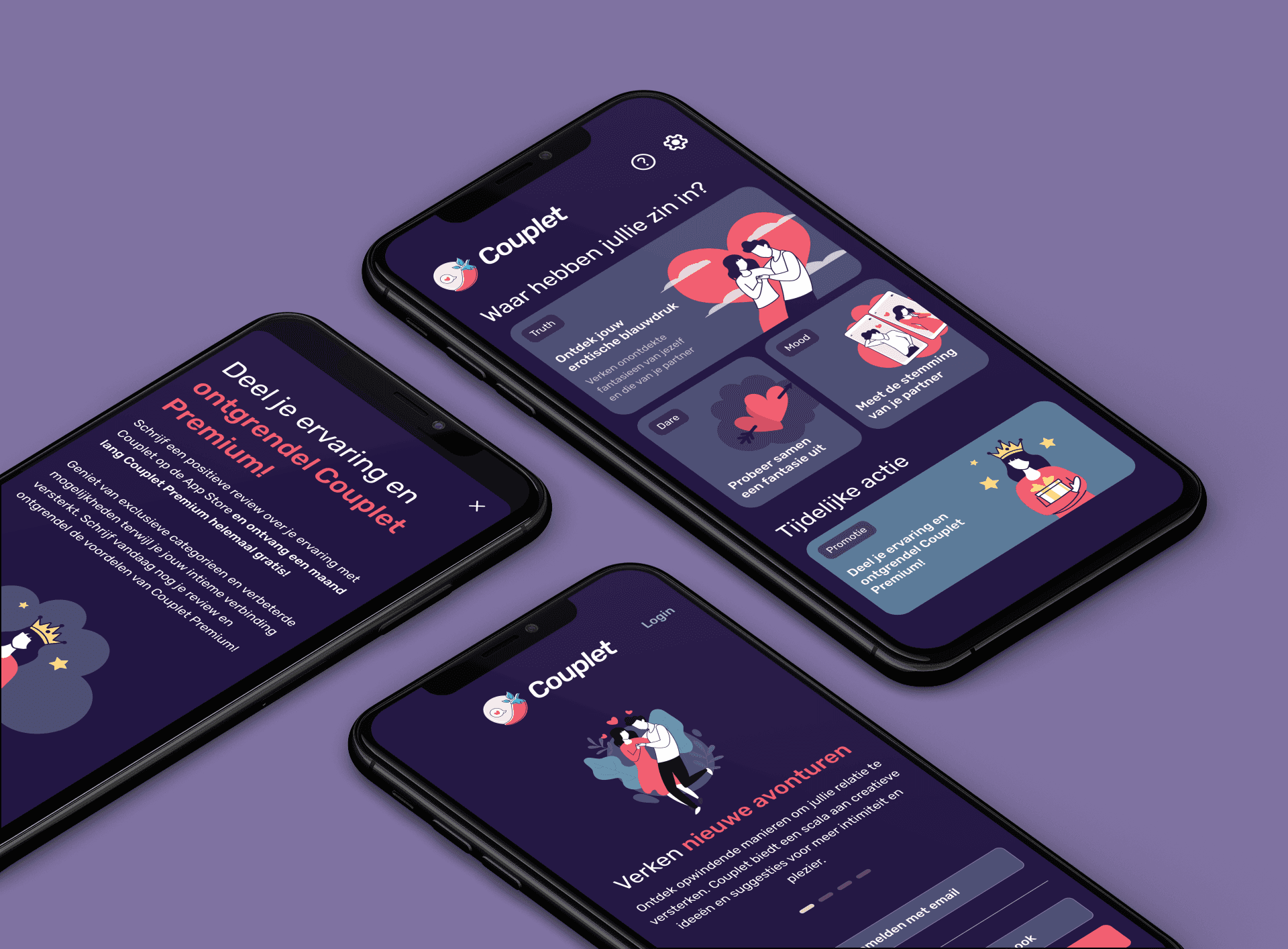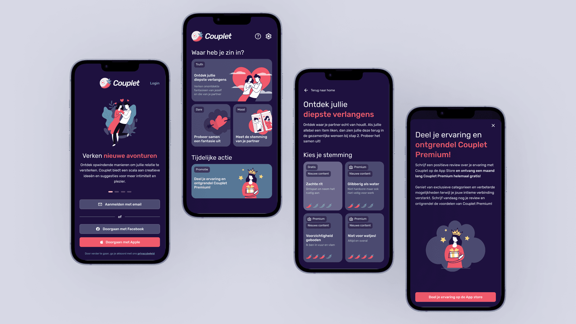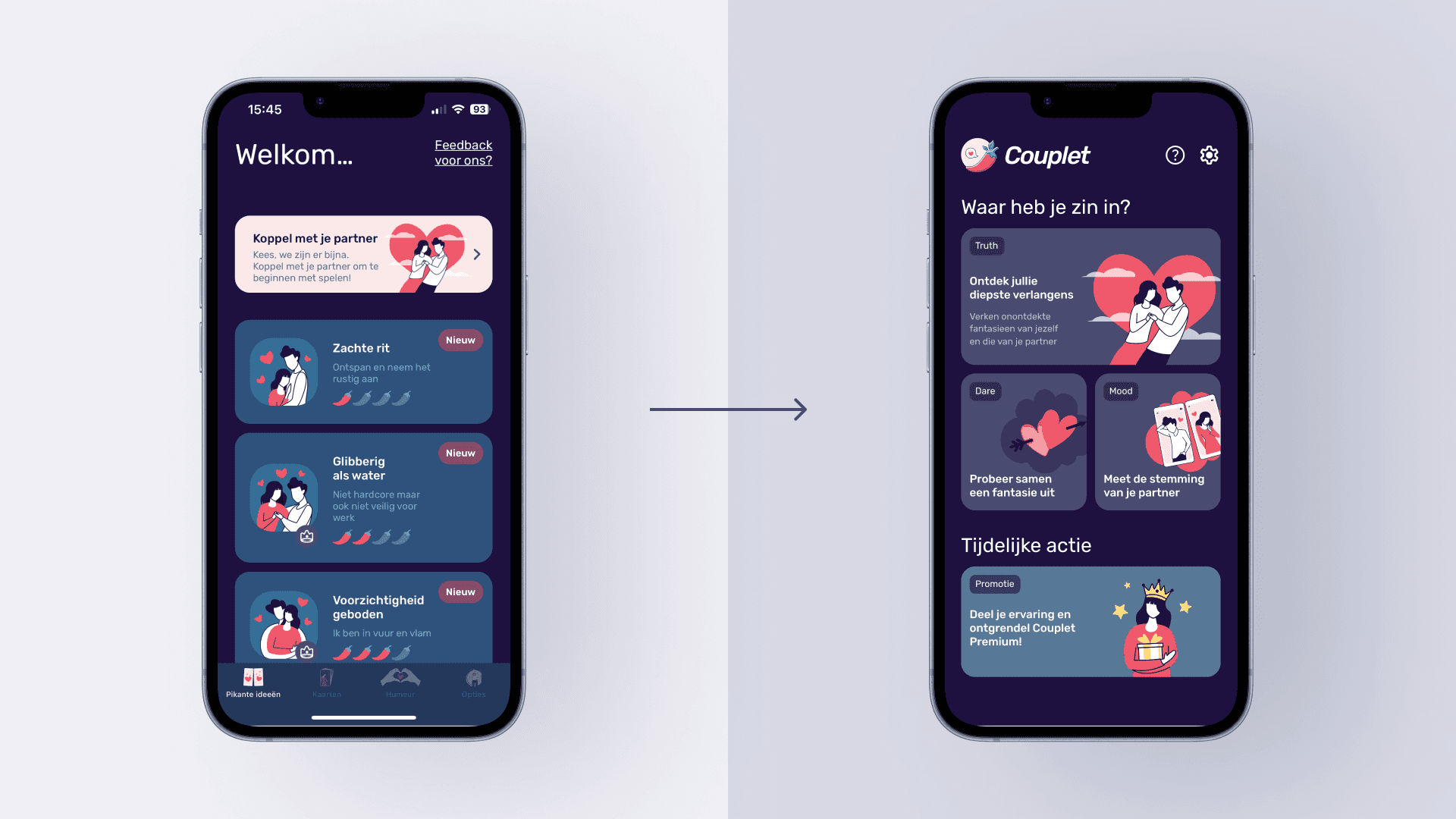 Couplet — an app with activity ideas for couples — was losing users before they'd seen its value. The onboarding flow was unclear, navigation confused first-time users, and the content categorisation made it hard to find relevant ideas. Downloads weren't converting to engaged users.